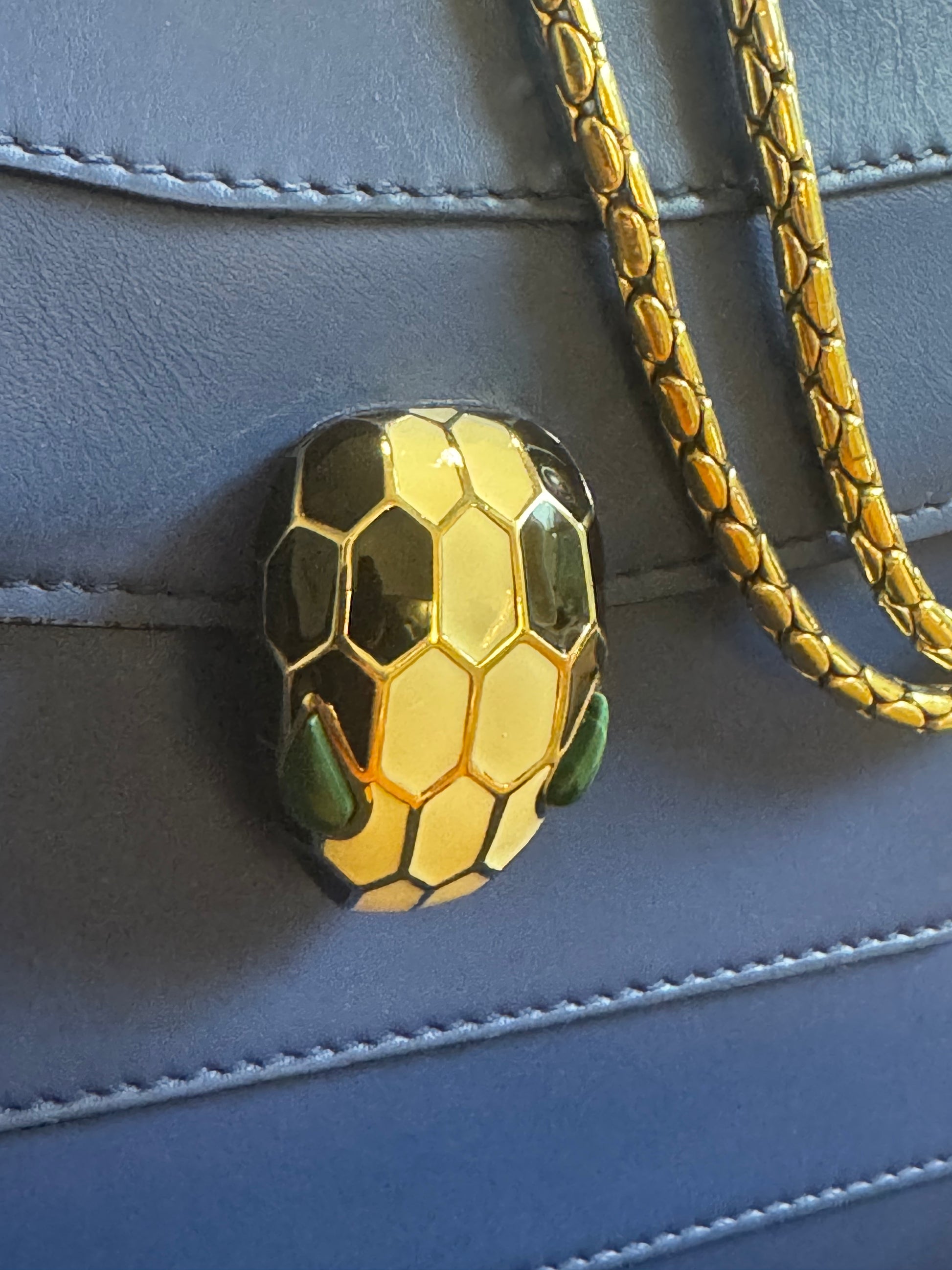 A striking and sophisticated piece, this Bulgari Serpenti Forever shoulder bag features smooth royal blue calfskin with the iconic enamel Serpenti head closure and gold-tone snake-chain strap. The structured silhouette and layered stitching create a refined, architectural look that makes this bag instantly recognizable.