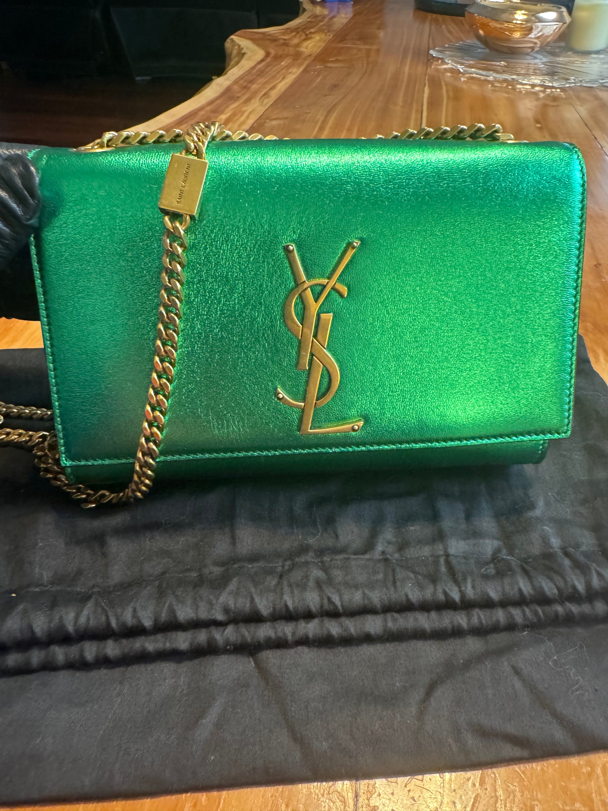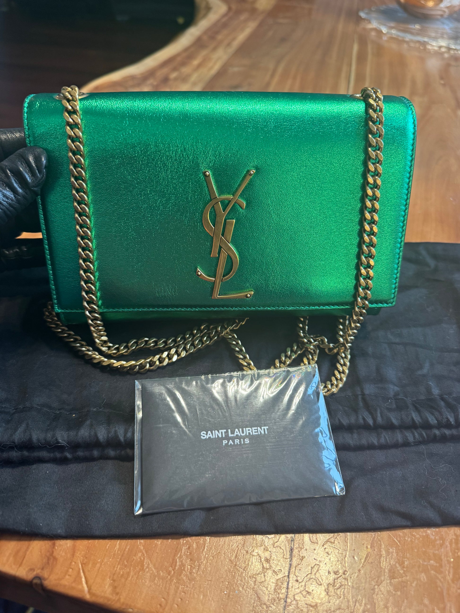 Stunning Saint Laurent Kate in rare metallic emerald-green calfskin, featuring the iconic gold YSL monogram, gold chain strap, and magnetic flap closure. Comes with its original dust bag.Excellent pre-loved condition with minimal signs of wear.